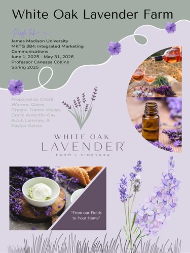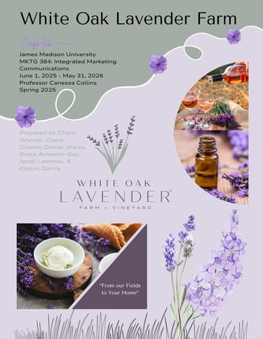 During my time at James Madison University, I had the opportunity to work with real companies to create a comprehensive IMC plan. This plan promotes White Oak Lavender Farm as a relaxing, nature-inspired destination in the Shenandoah Valley. It combines digital marketing, print media, and public relations to increase brand awareness, attract visitors, and boost sales. The strategy focuses on wellness and sustainability to create a consistent and engaging brand experience across all channels.