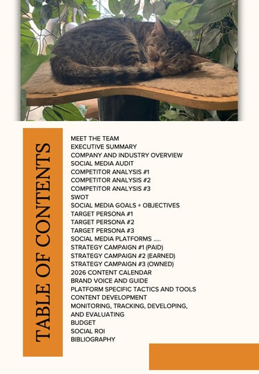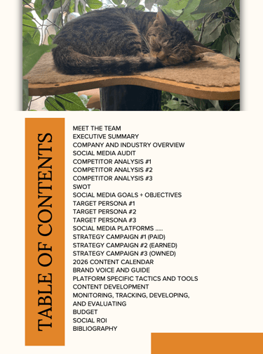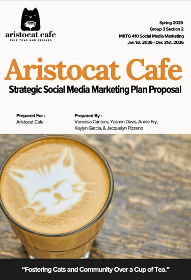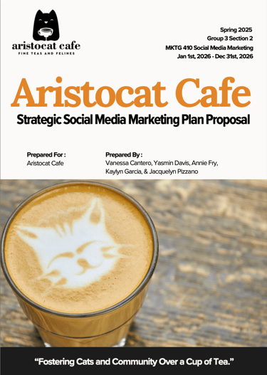 This social media marketing plan for Aristocat Café focuses on strengthening the brand's online presence to increase cat adoptions from the Humane Society of Shenandoah County. I gained skills in conducting detailed competitor analyses, developing effective consumer personas, paid and organic campaigns, and platform-specific strategies. By tracking and setting a budget for each tactic, the plan aims to boost their brand, engagement, and adoptions while showcasing the café's cozy atmosphere and love for cats.